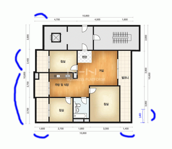 시공하려는 부분은 파란색으로 된 부분입니다. 20층중 19층이라 좀 다른집보다 좀 벽 높이가 높습니다. 30~40정도 높은거 같습니다. 대략 23T몇 장정도로 마무리 가능할까요?